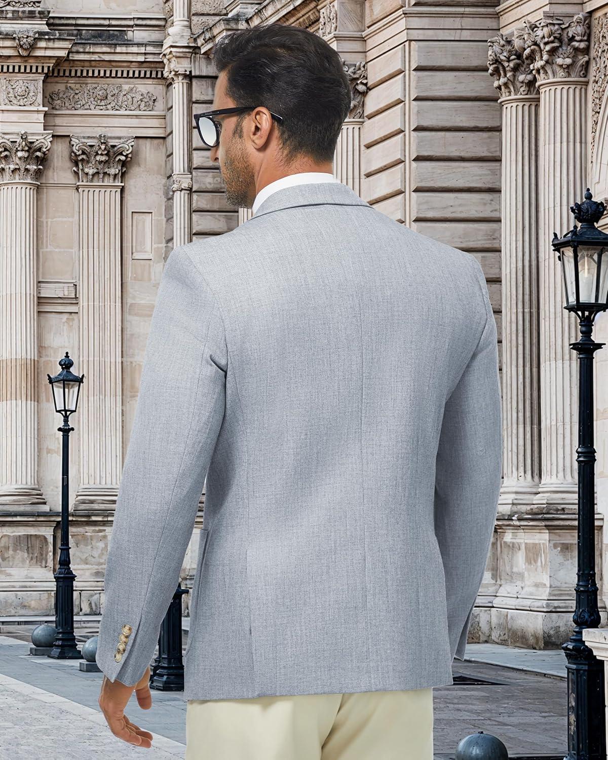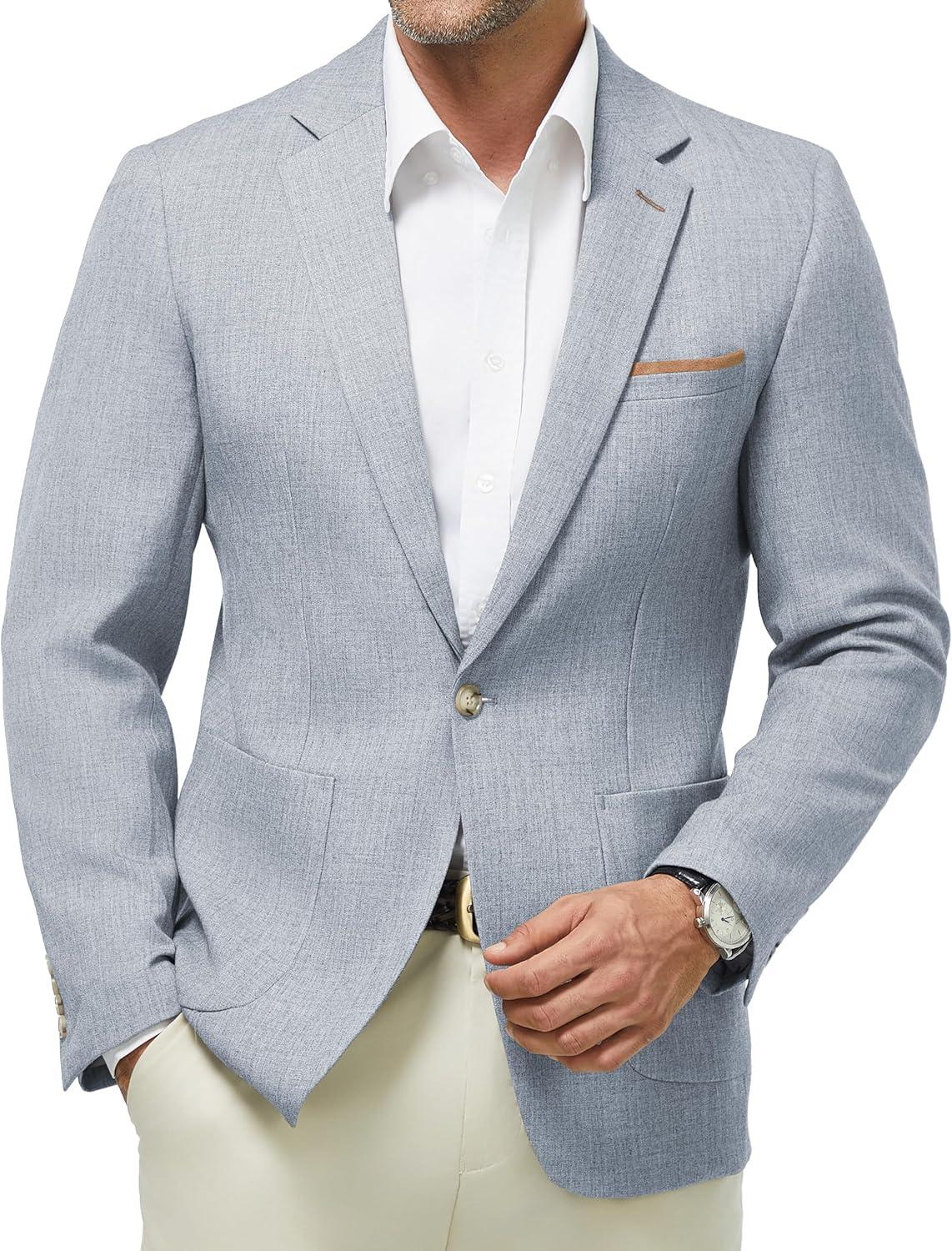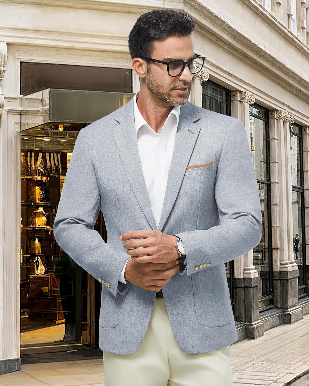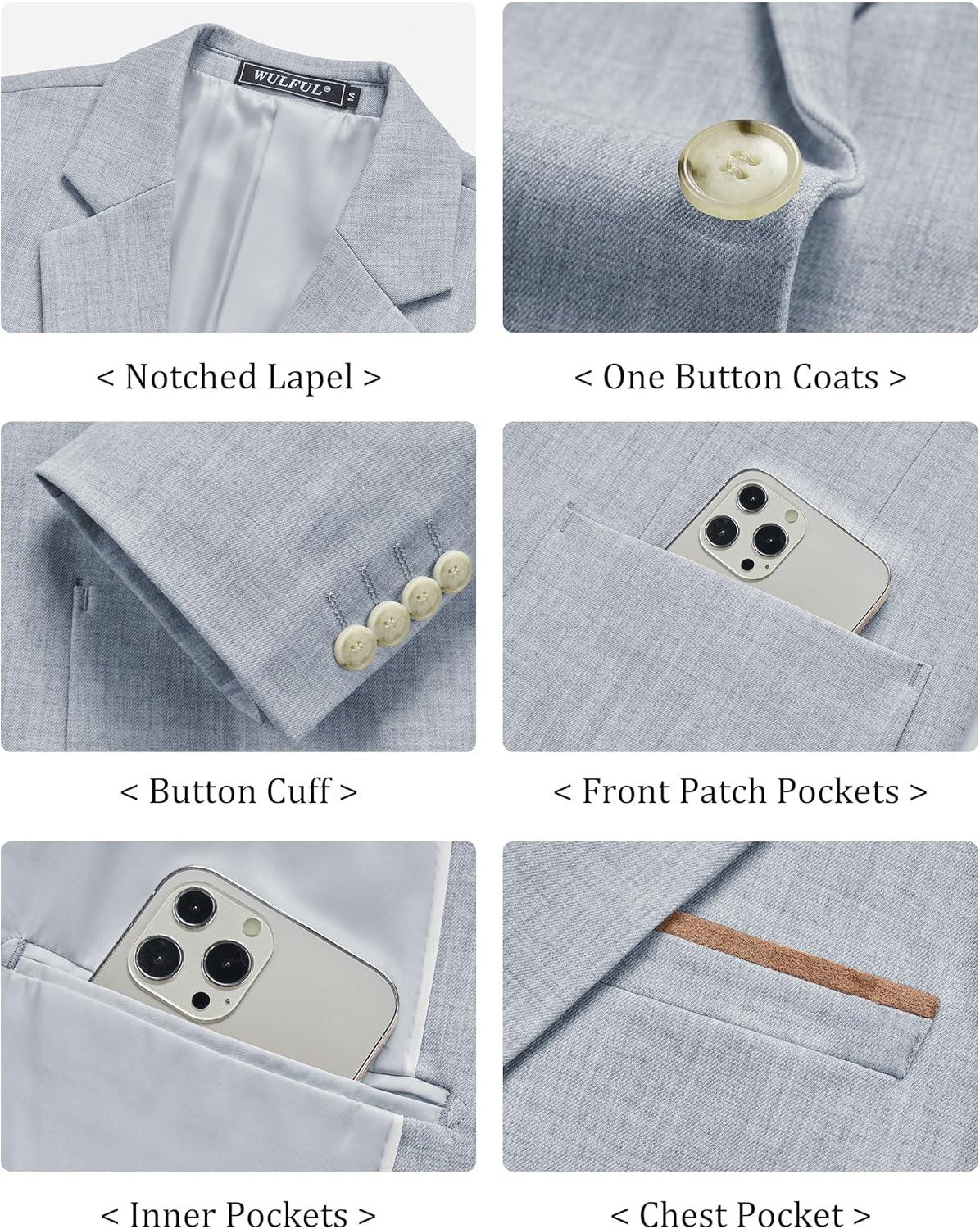 Mens Casual Sport Coat,men lightweight one button suit jackets Features Colors:a notched lapel and a one-button closure, two flap pockets,two inside pockets,and a chest welt pocket for a pocket square Colors:Light Blue,beige,light grey Size:S-3XL available