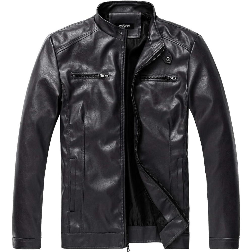 imageWULFUL Mens Stand Collar Leather Jacket Motorcycle Lightweight Faux Leather OutwearBlack1301