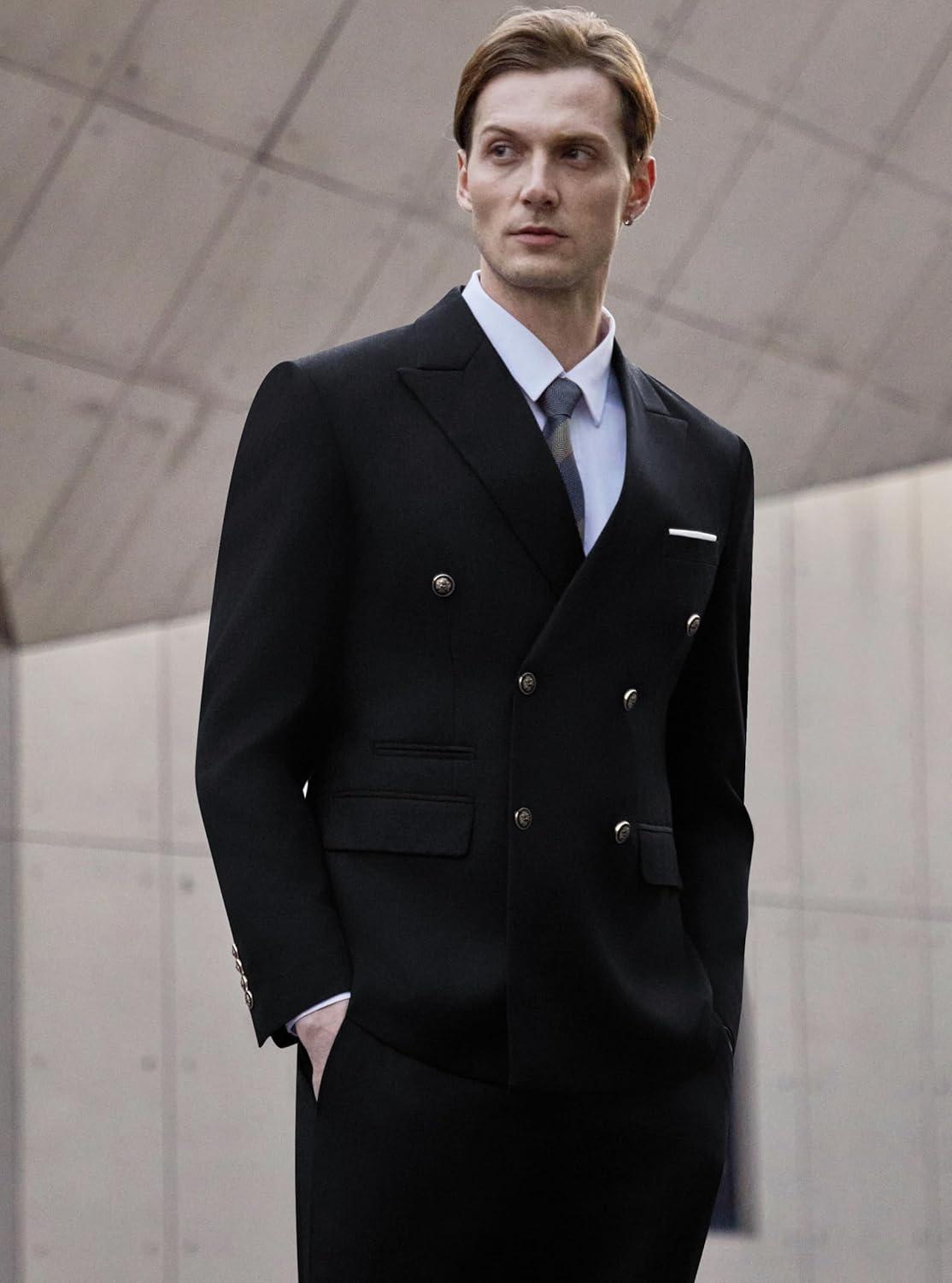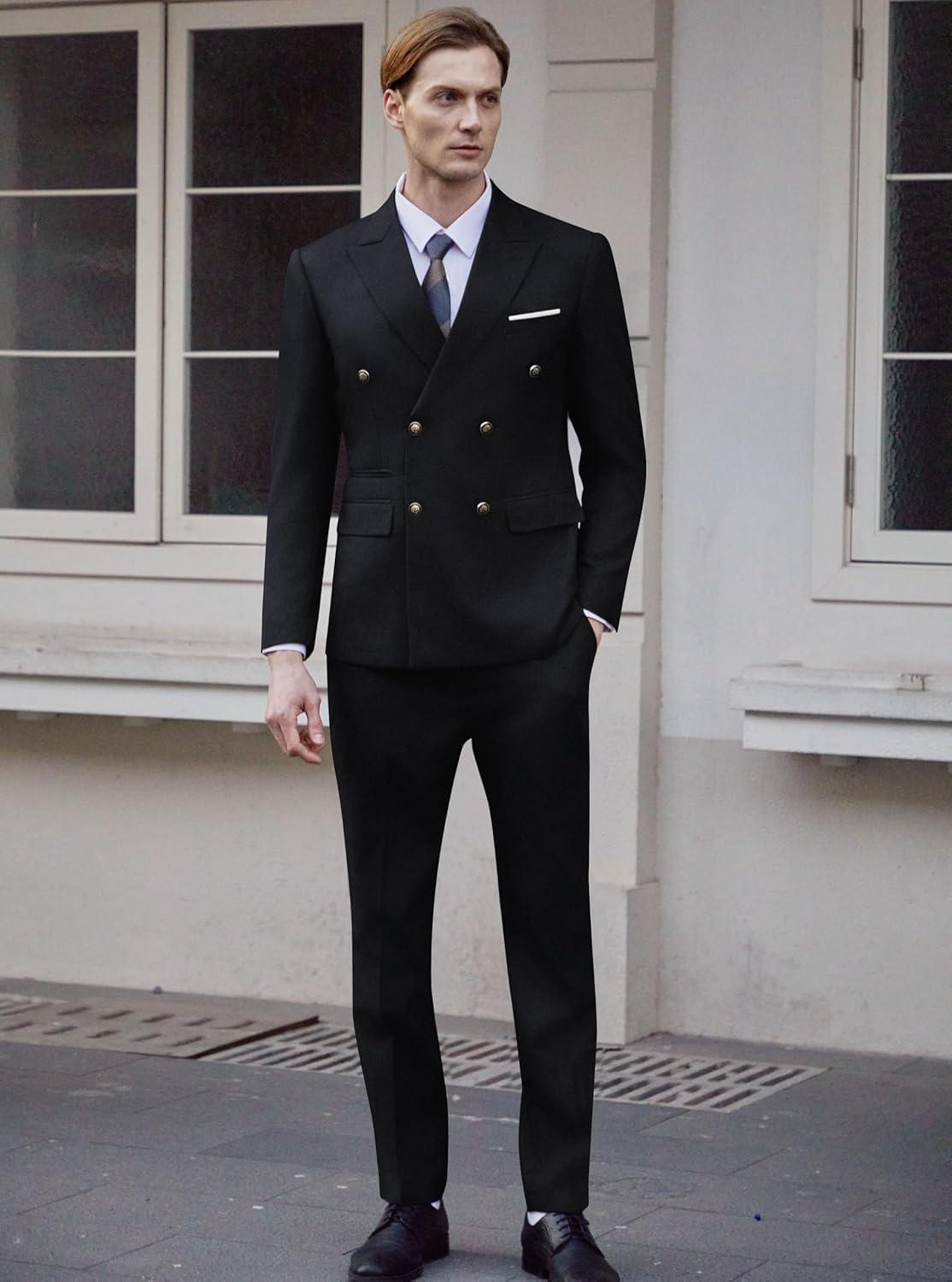 WULFUL Men's Suits Slim Fit 2 Piece Double Breasted Suit Men Tuxedo Blazer Jacket and Dress Pants Set for Business Wedding(Black)