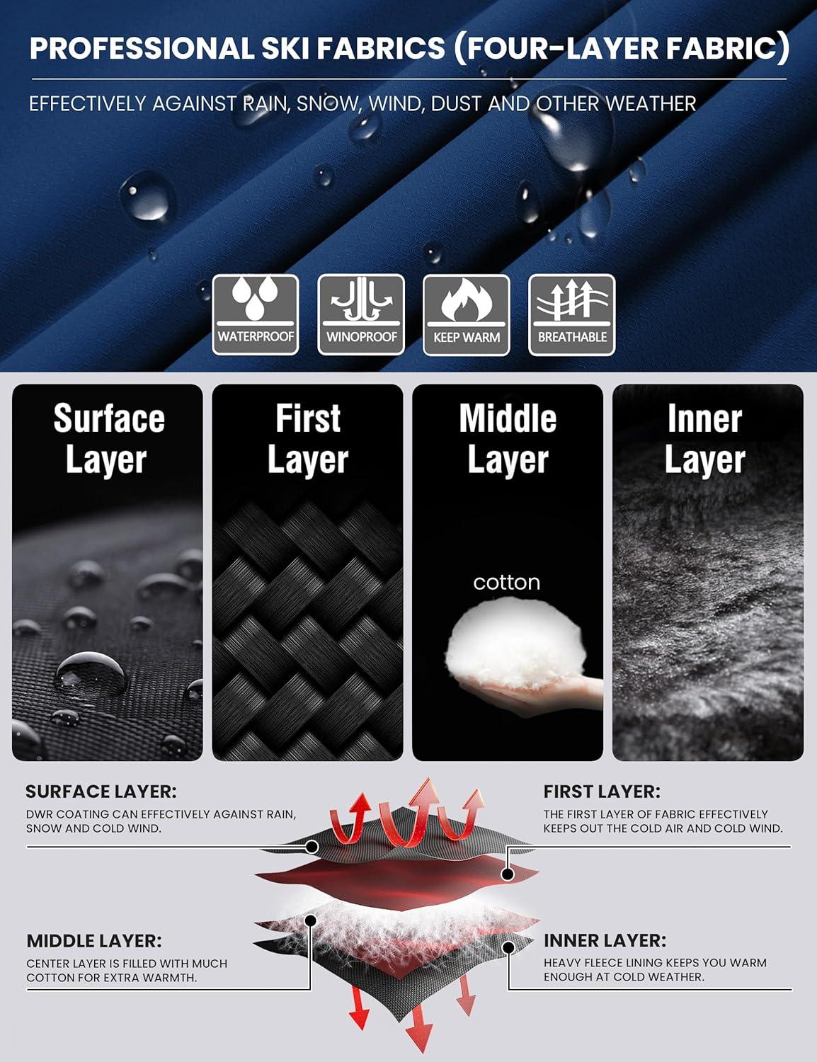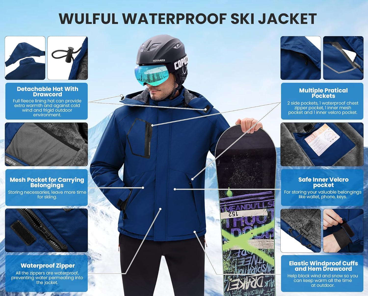 WULFUL Men’s Waterproof Ski Jacket Warm Winter Coats Windproof Winter Jackets for Men Fleece Lined Windbreaker with Hood(Light Navy Blue)