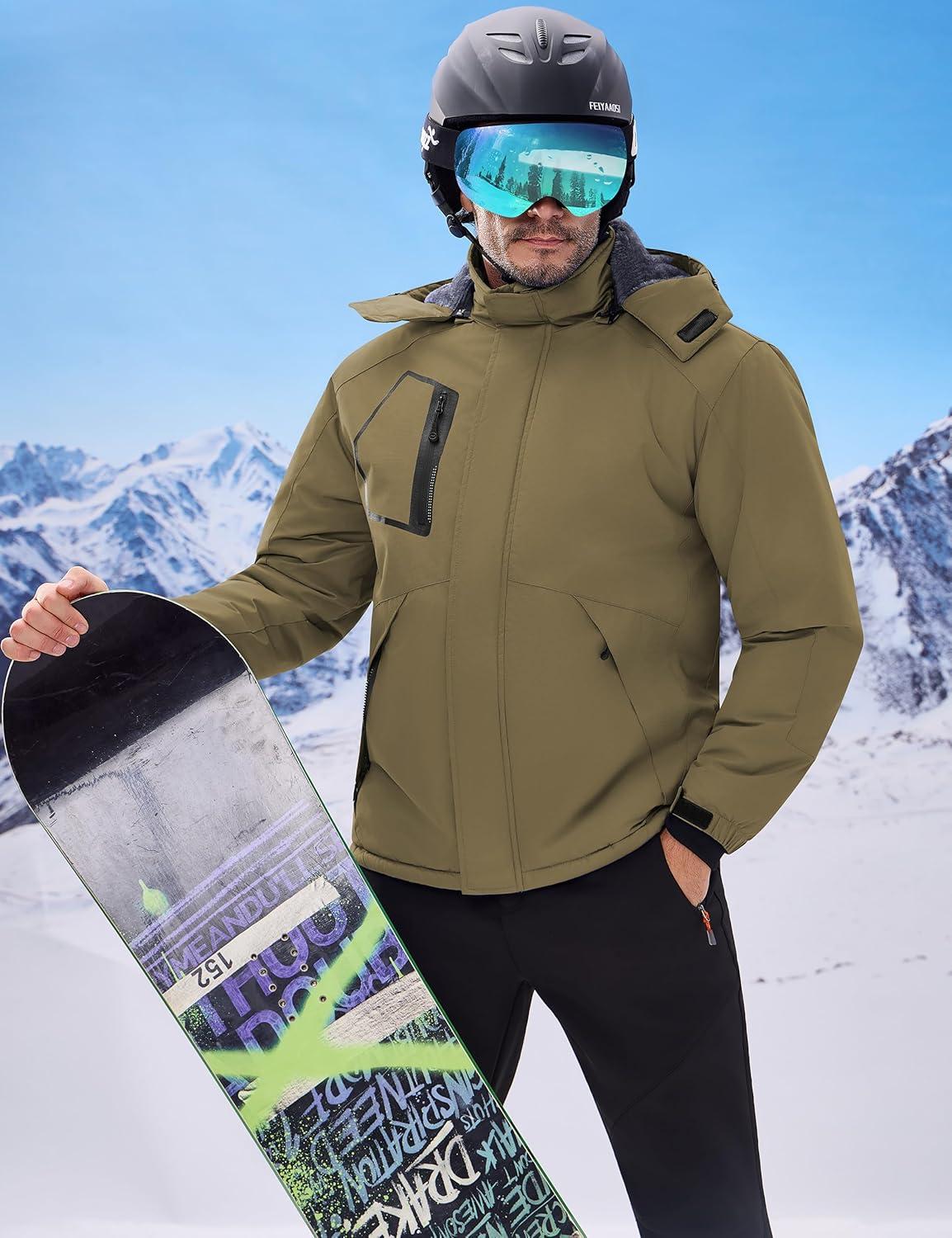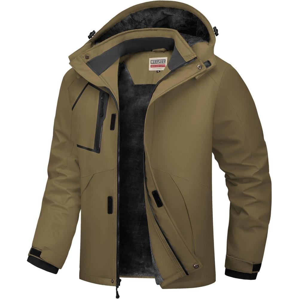 WULFUL Men's Waterproof Ski Jacket Warm Winter Coats Windproof Winter Jackets for Men Fleece Lined Windbreaker with Hood(Olive Brown)