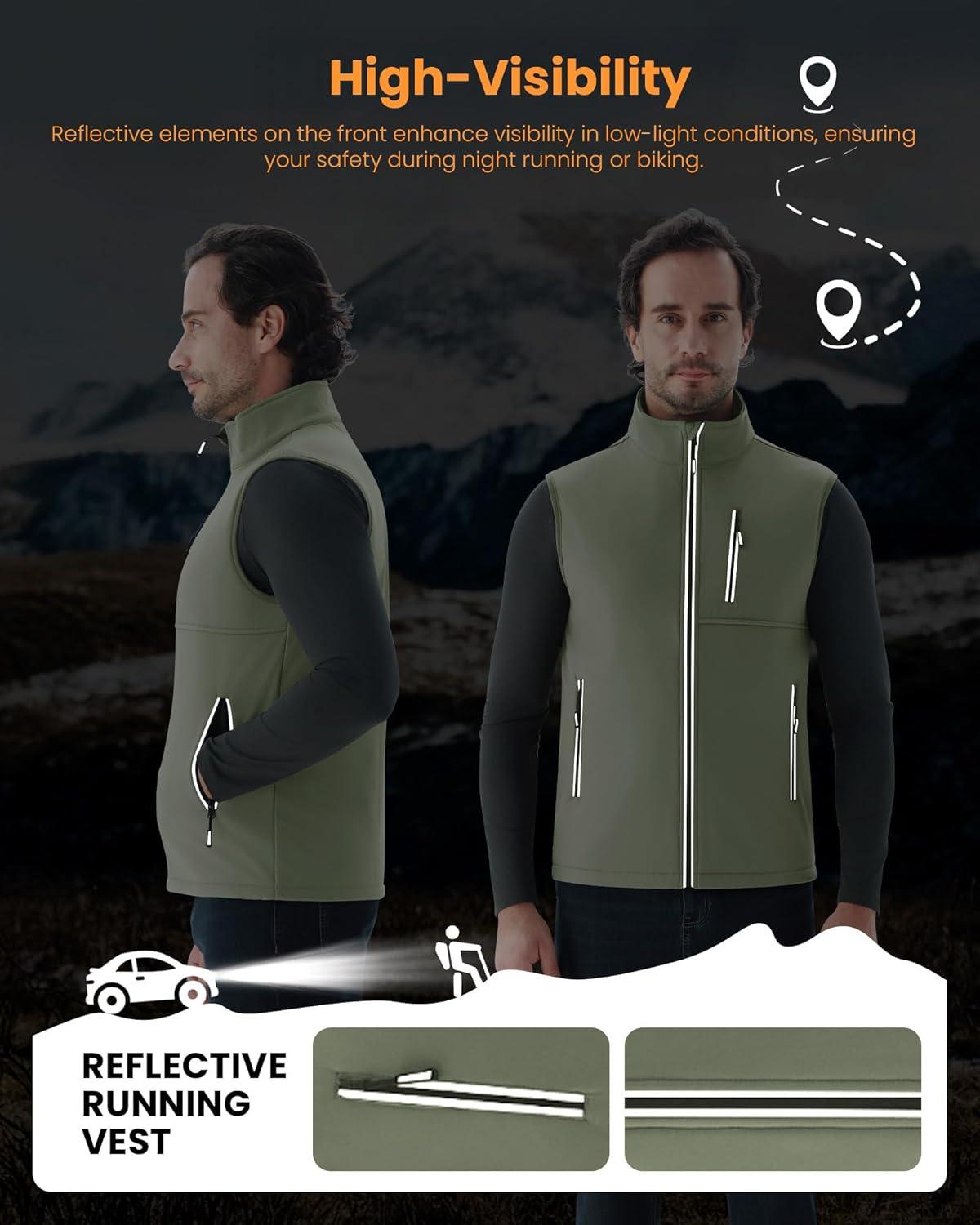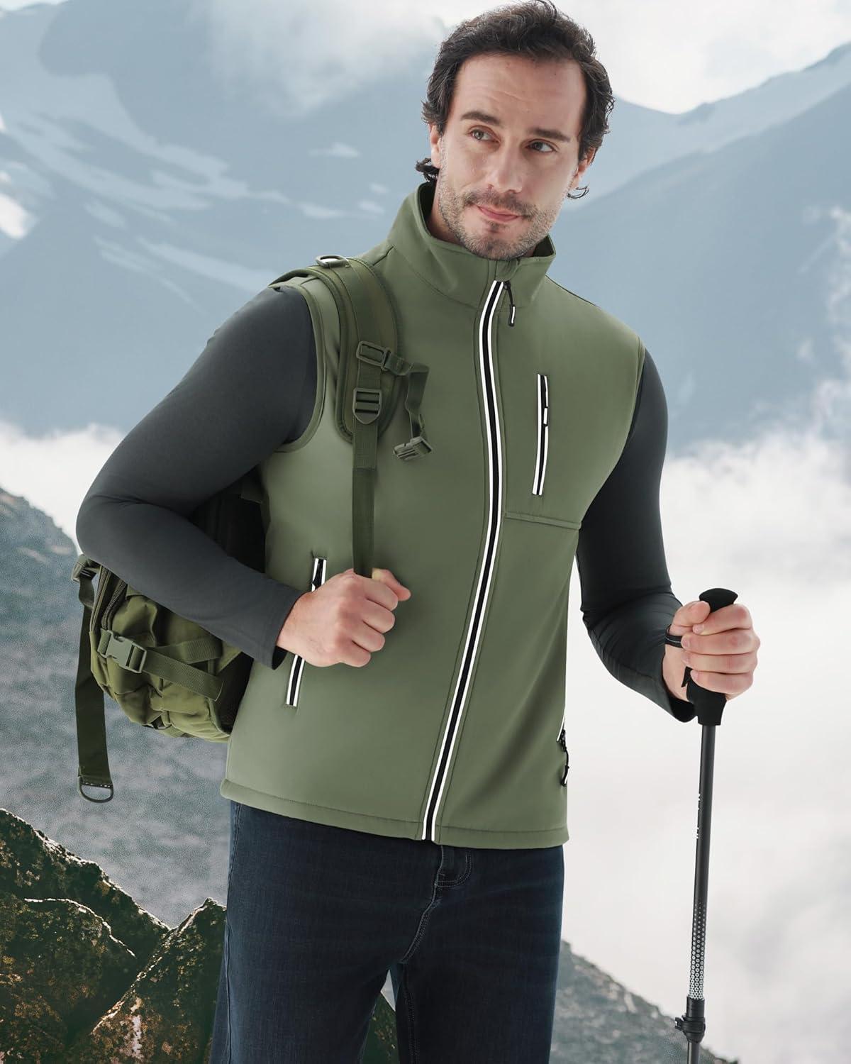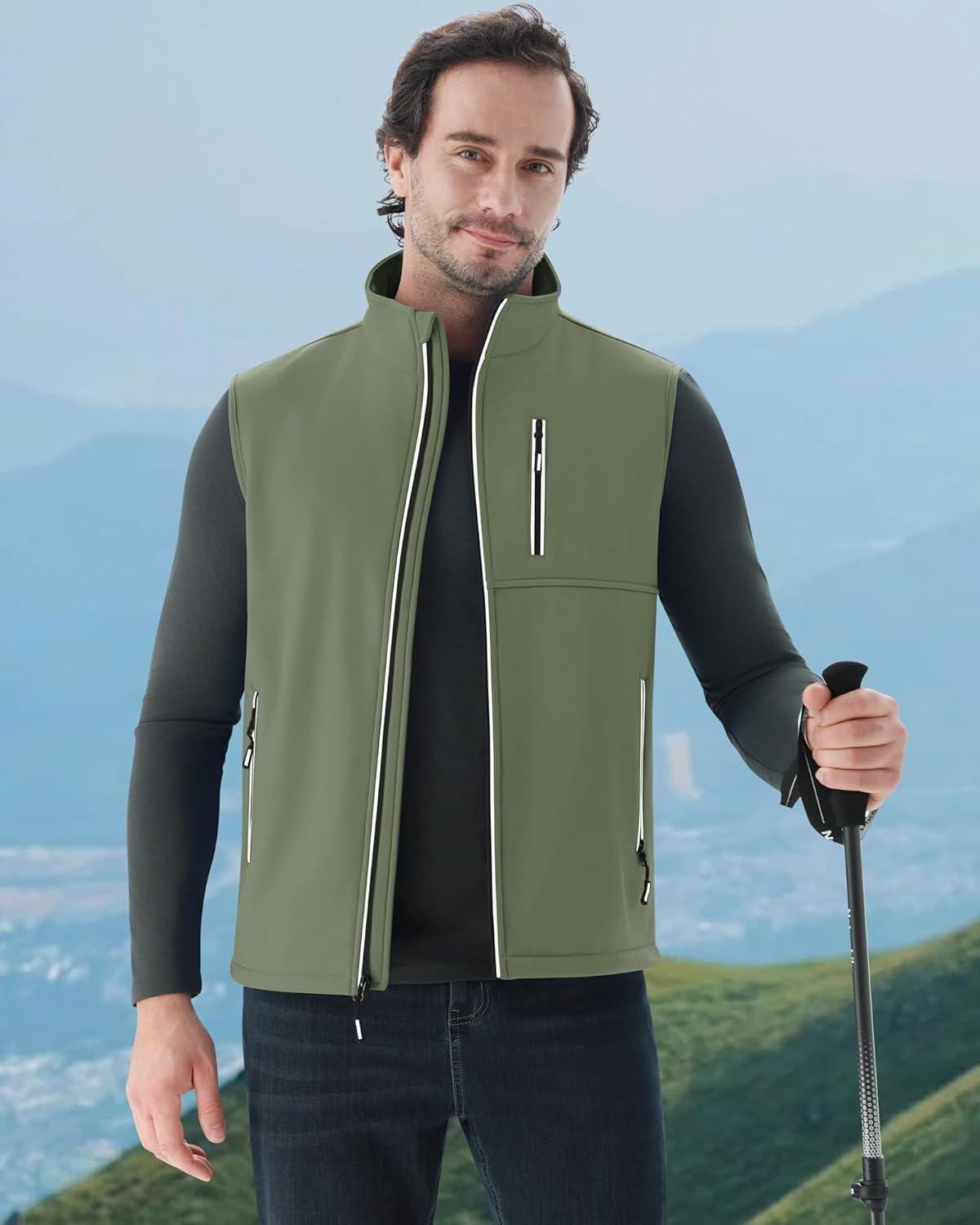 WULFUL Men’s Windproof Lightweight Golf Vest Outerwear with Pockets, Softshell Sleeveless Jacket for Travel Hiking Running(Army Green)