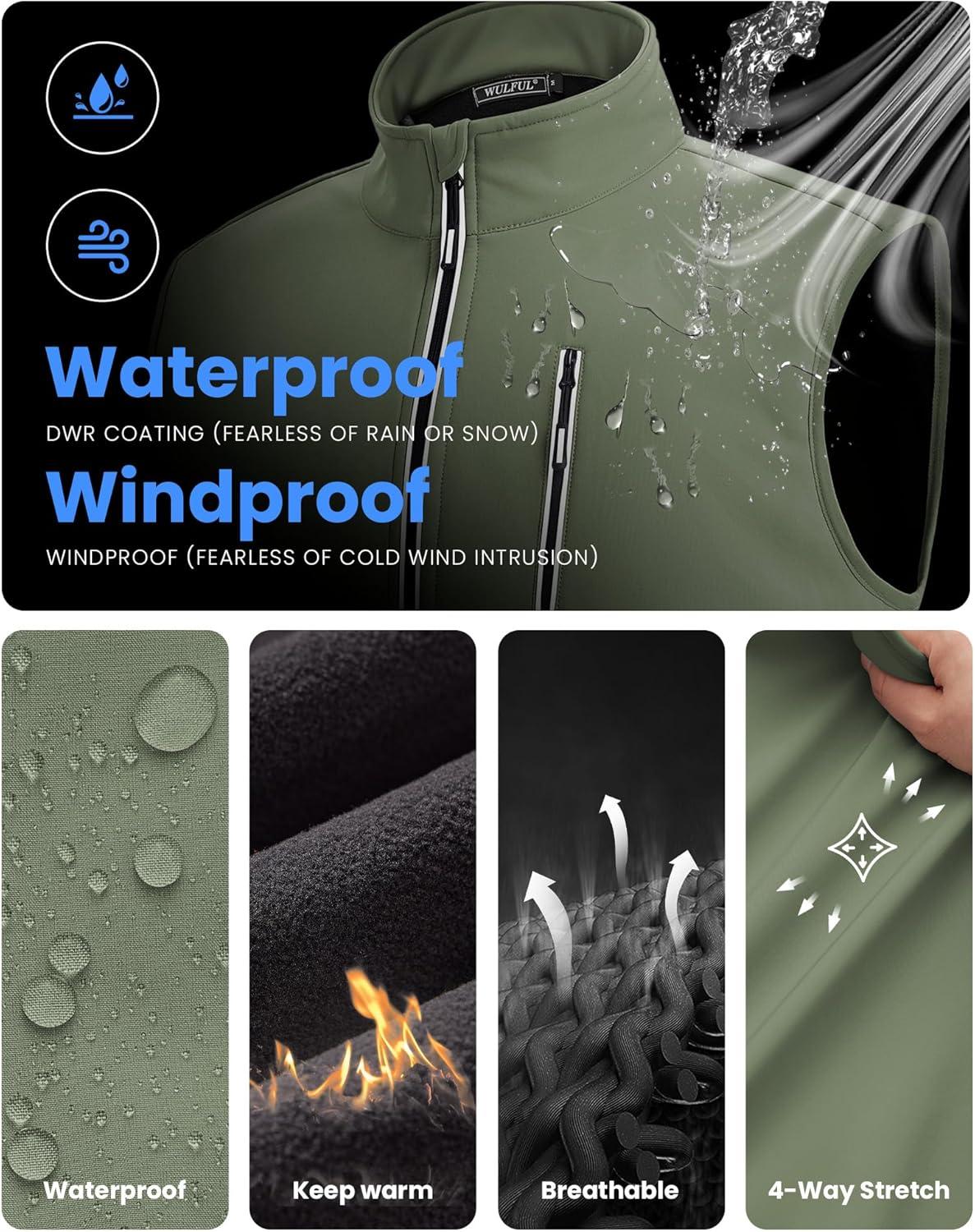 imageWULFUL Mens Windproof Lightweight Golf Vest Outerwear with Pockets Softshell Sleeveless Jacket for Travel Hiking RunningArmy Green