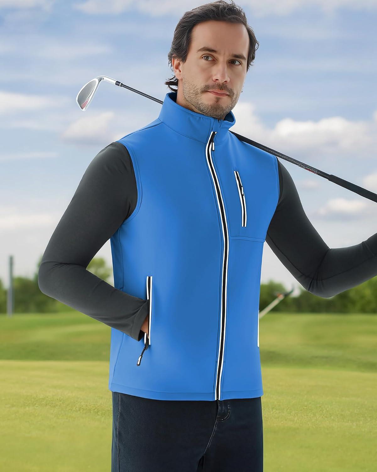 WULFUL Men’s Windproof Lightweight Golf Vest Outerwear with Pockets, Softshell Sleeveless Jacket for Travel Hiking Running(Bright Blue)