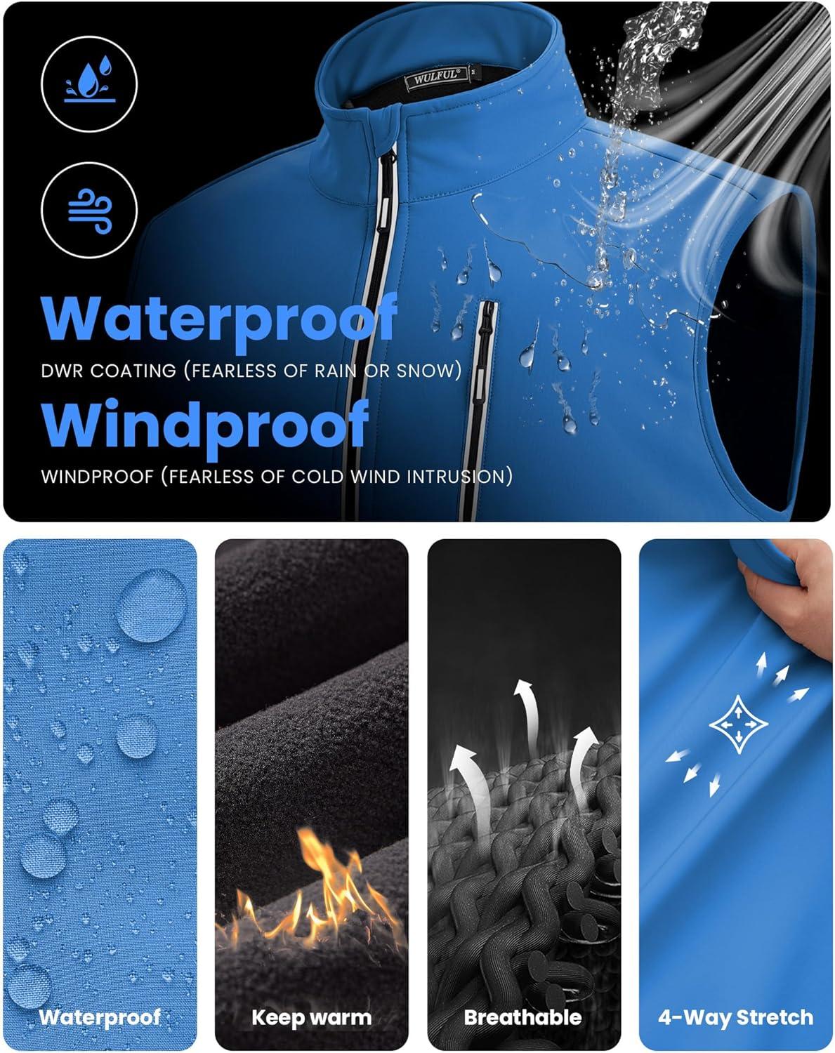 imageWULFUL Mens Windproof Lightweight Golf Vest Outerwear with Pockets Softshell Sleeveless Jacket for Travel Hiking RunningBright Blue