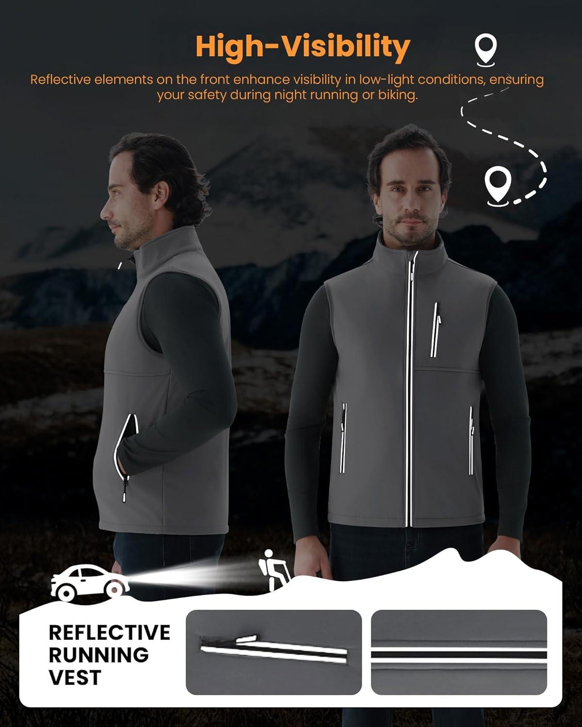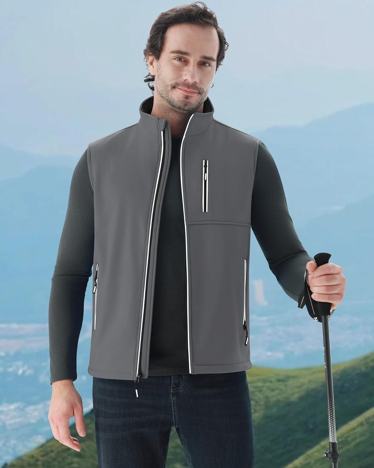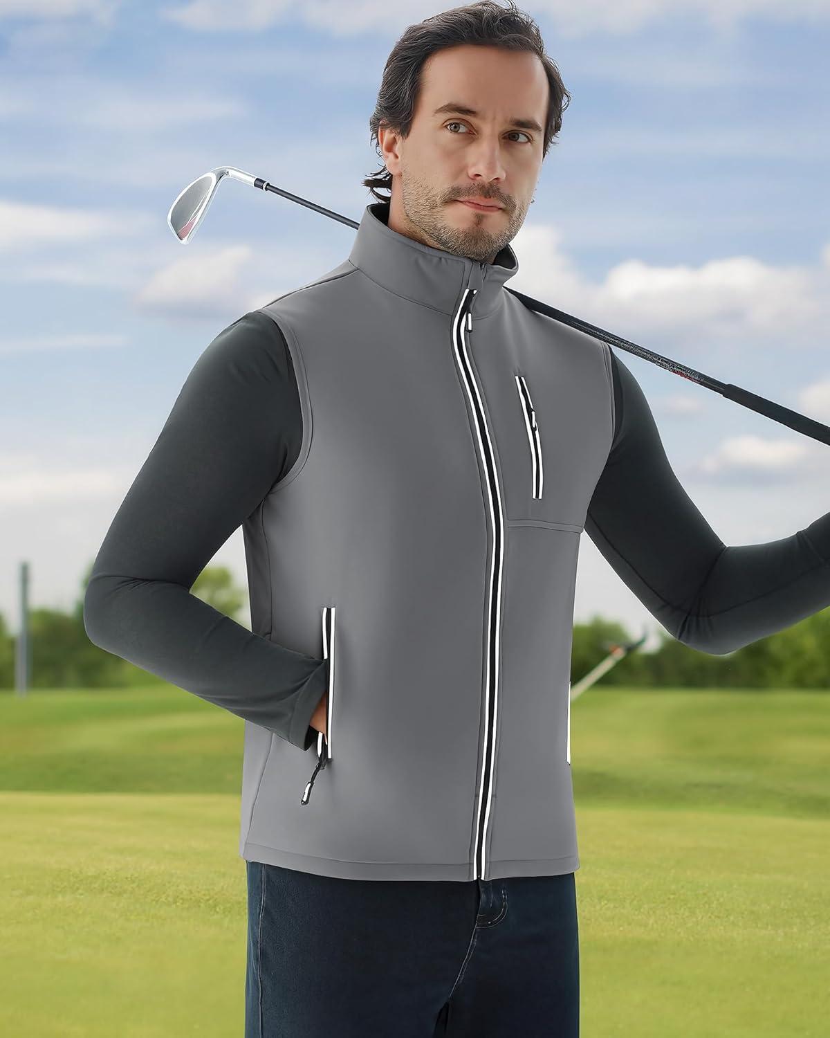 WULFUL Men’s Windproof Lightweight Golf Vest Outerwear with Pockets, Softshell Sleeveless Jacket for Travel Hiking Running(Dark Grey)