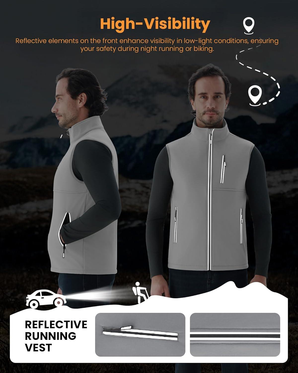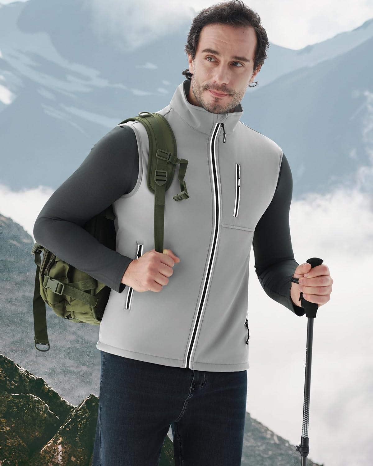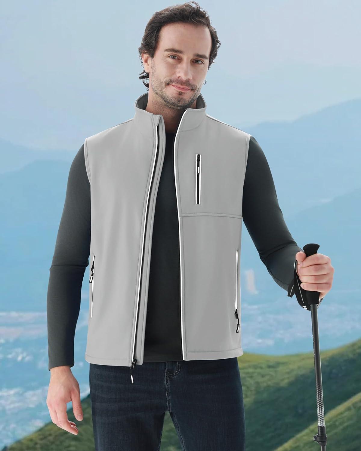 WULFUL Men’s Windproof Lightweight Golf Vest Outerwear with Pockets, Softshell Sleeveless Jacket for Travel Hiking Running(Light Grey)