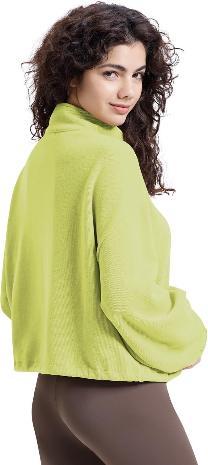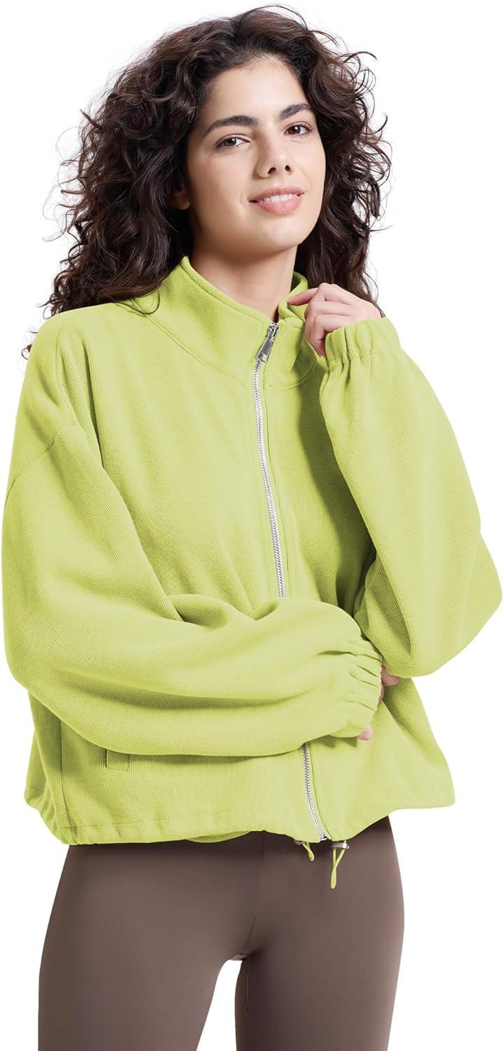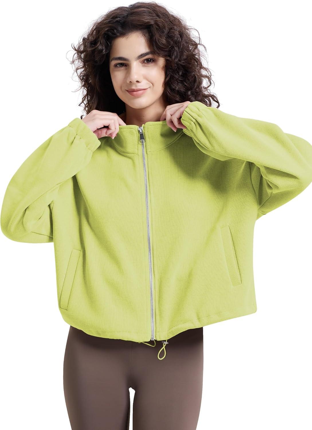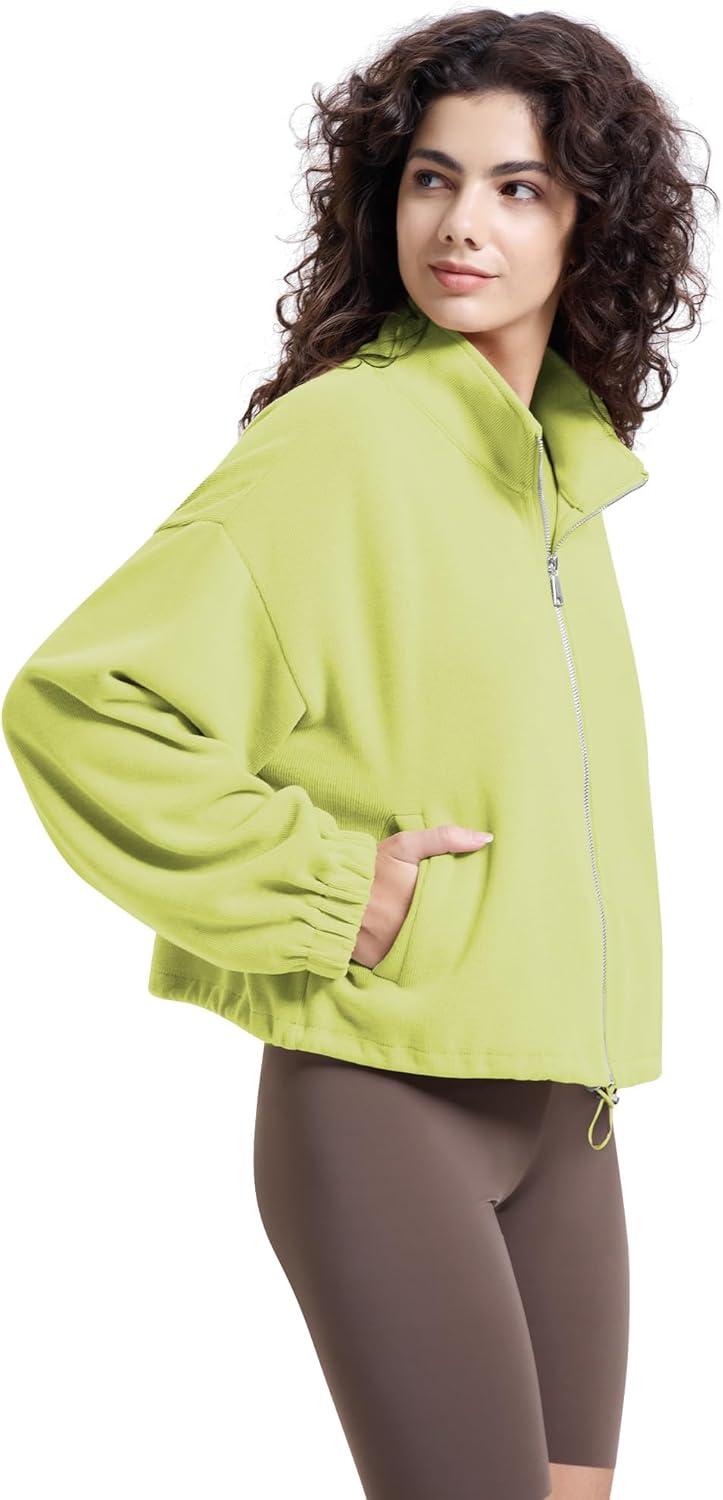WULFUL Women’s Full Zip Cropped Sweatshirt Long Sleeve Stand Collar Casual Jacket Short(Green)