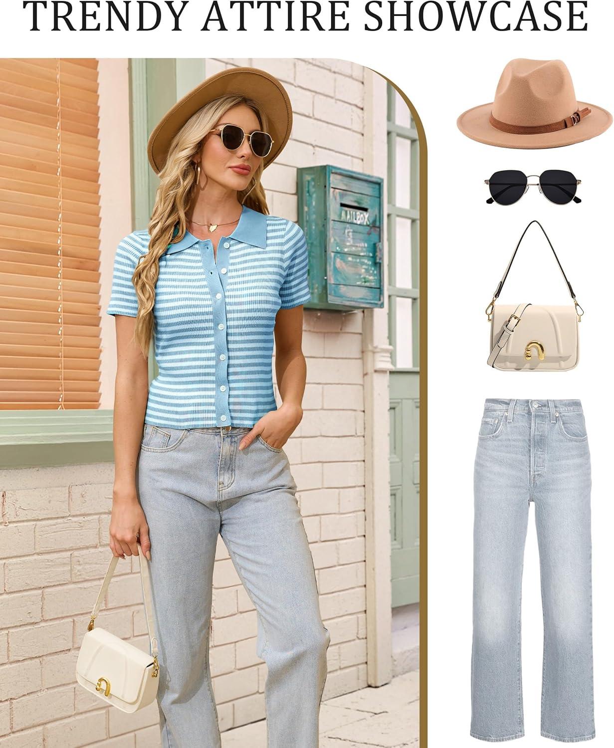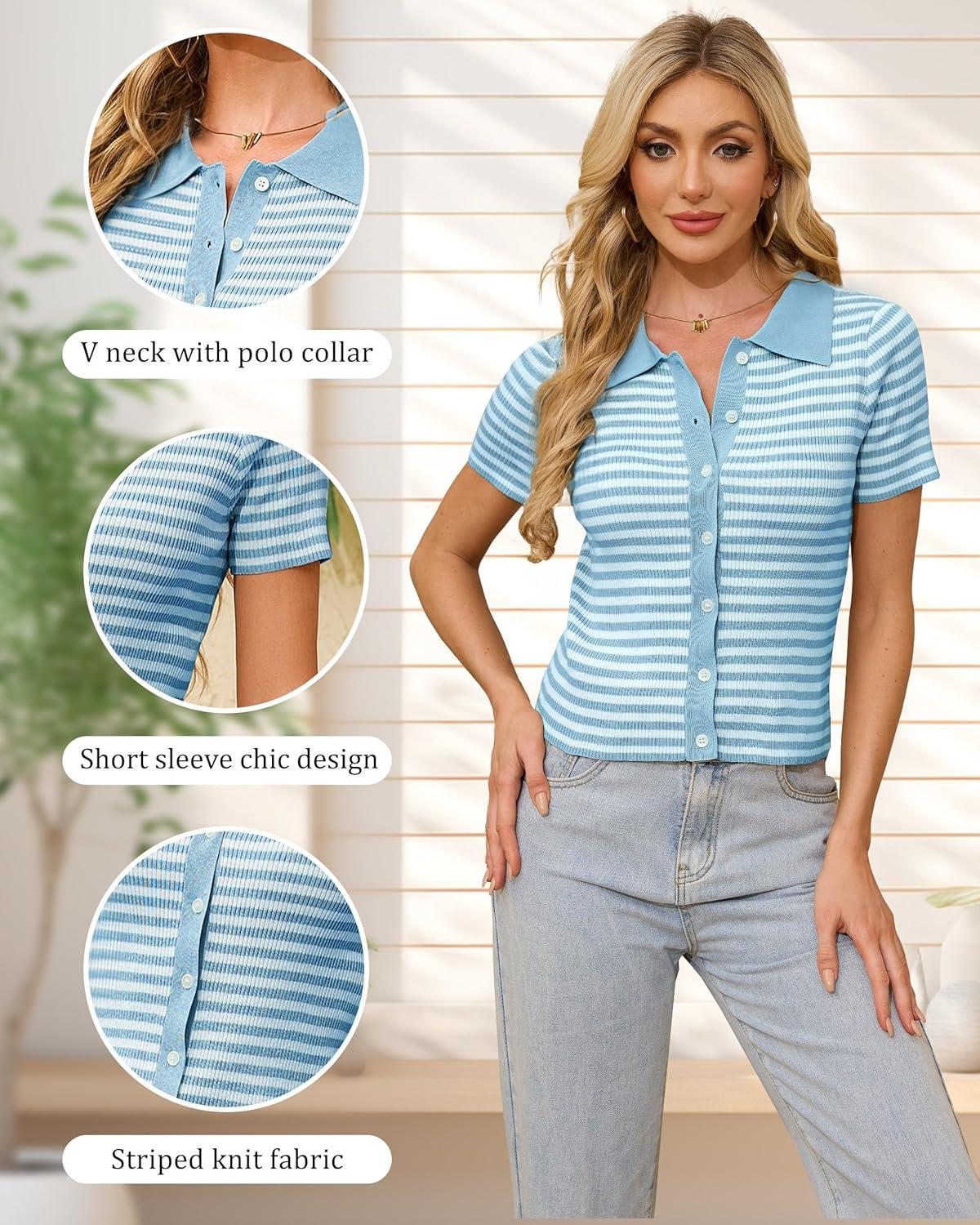 WULFUL Womens Short Sleeve Striped Pullover Sweater Cardigan Ribbed Knit Casual V Neck Shirt Tops(Lake Blue)