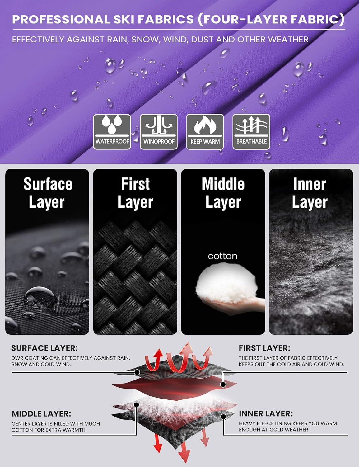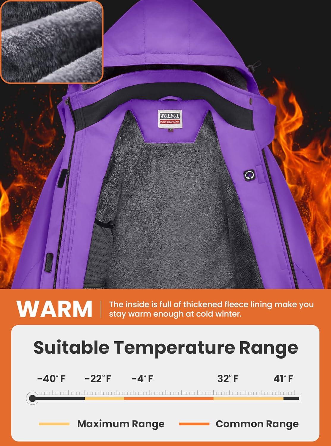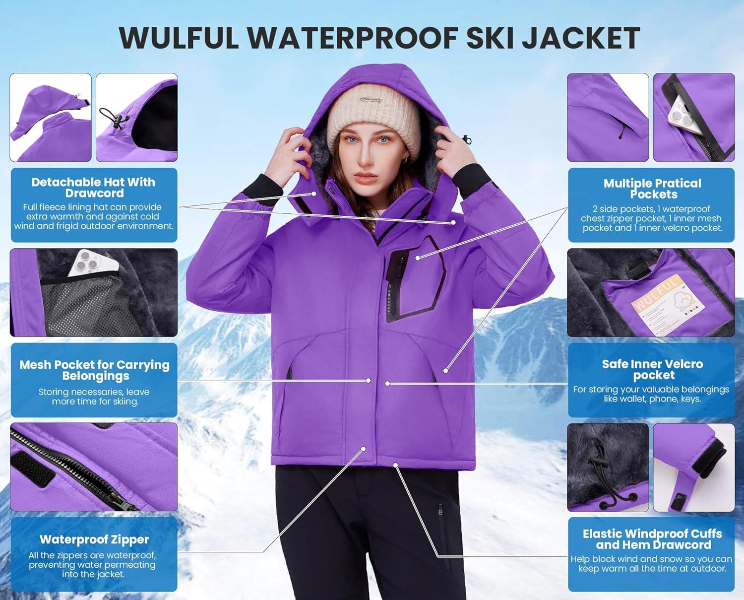 WULFUL Women’s Waterproof Ski Jacket Warm Winter Coats Windproof Winter Jackets for Women Fleece Lined Windbreaker with Hood(Purple)