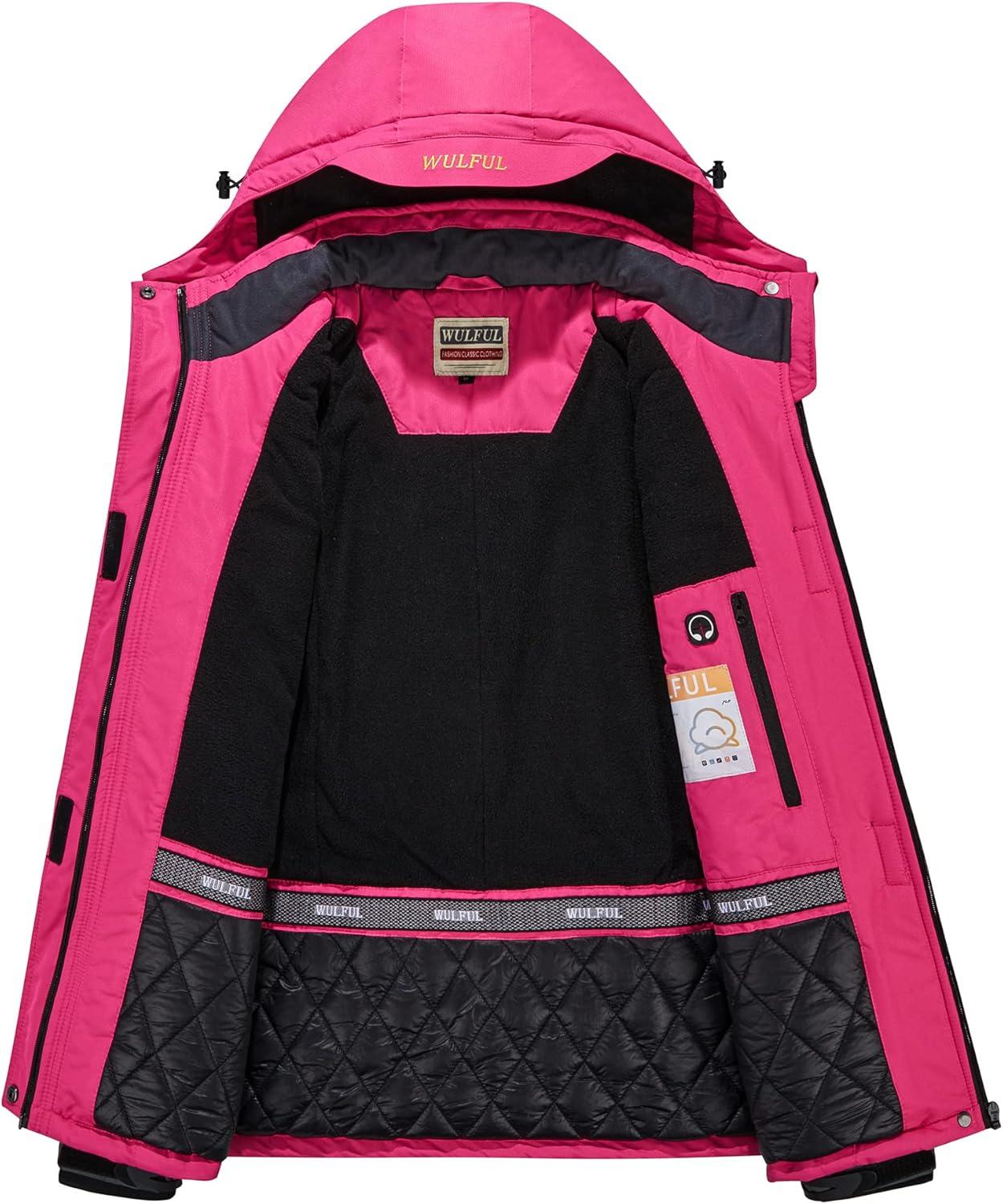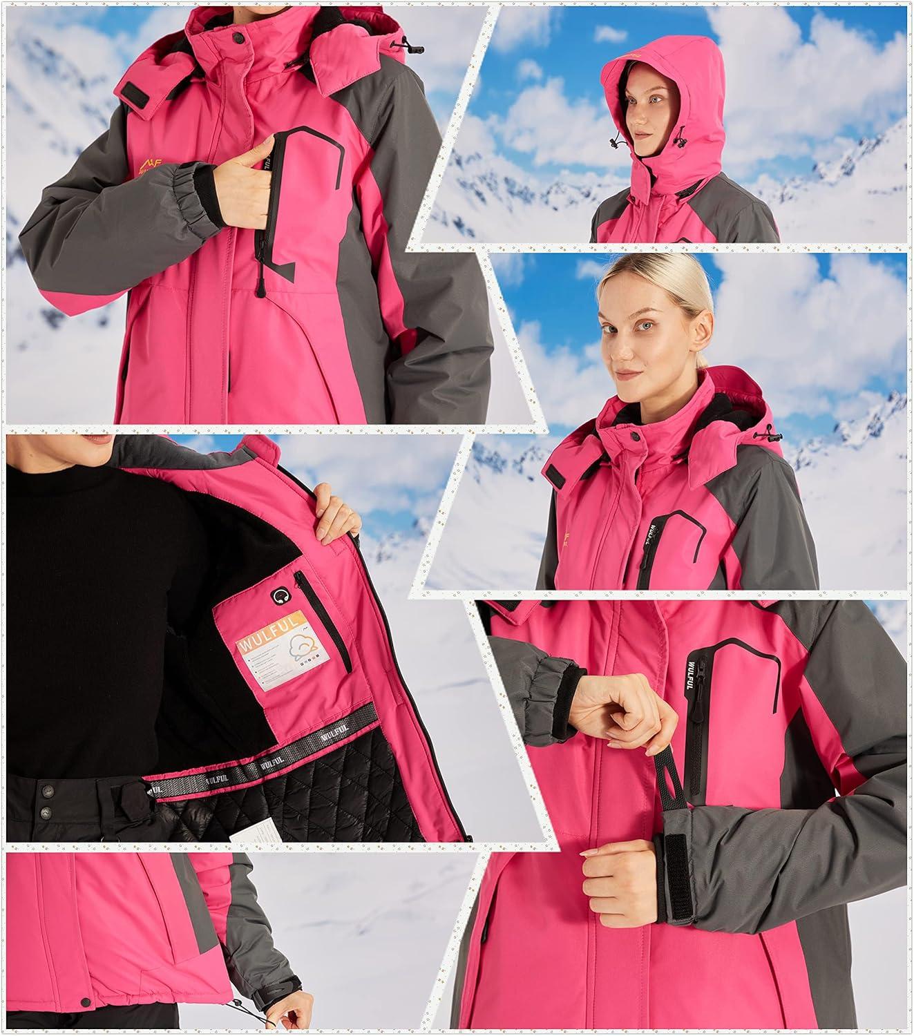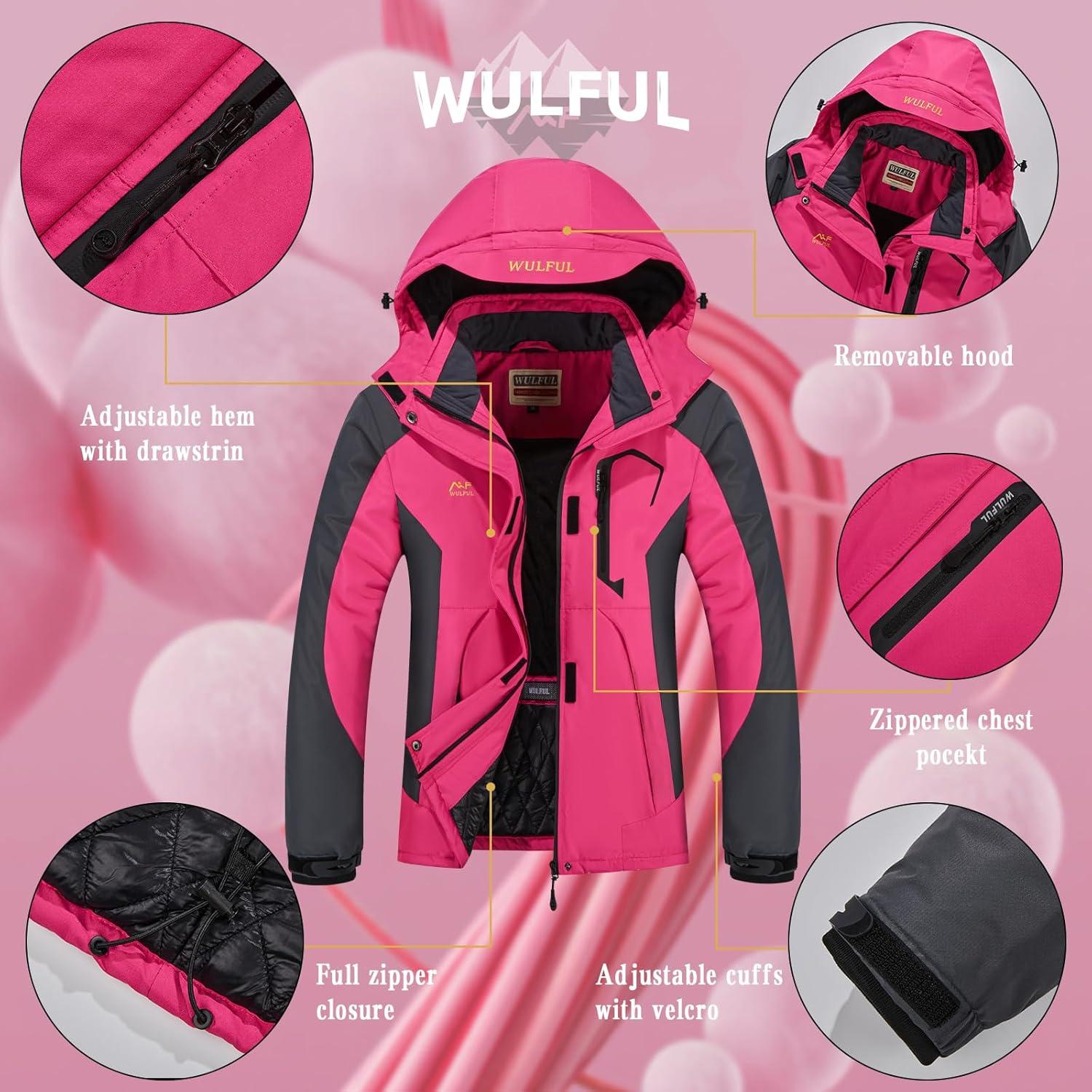 WULFUL Women’s Waterproof Snow Ski Jacket Mountain Windproof Winter Coat with Detachable Hood(Rose&black)
