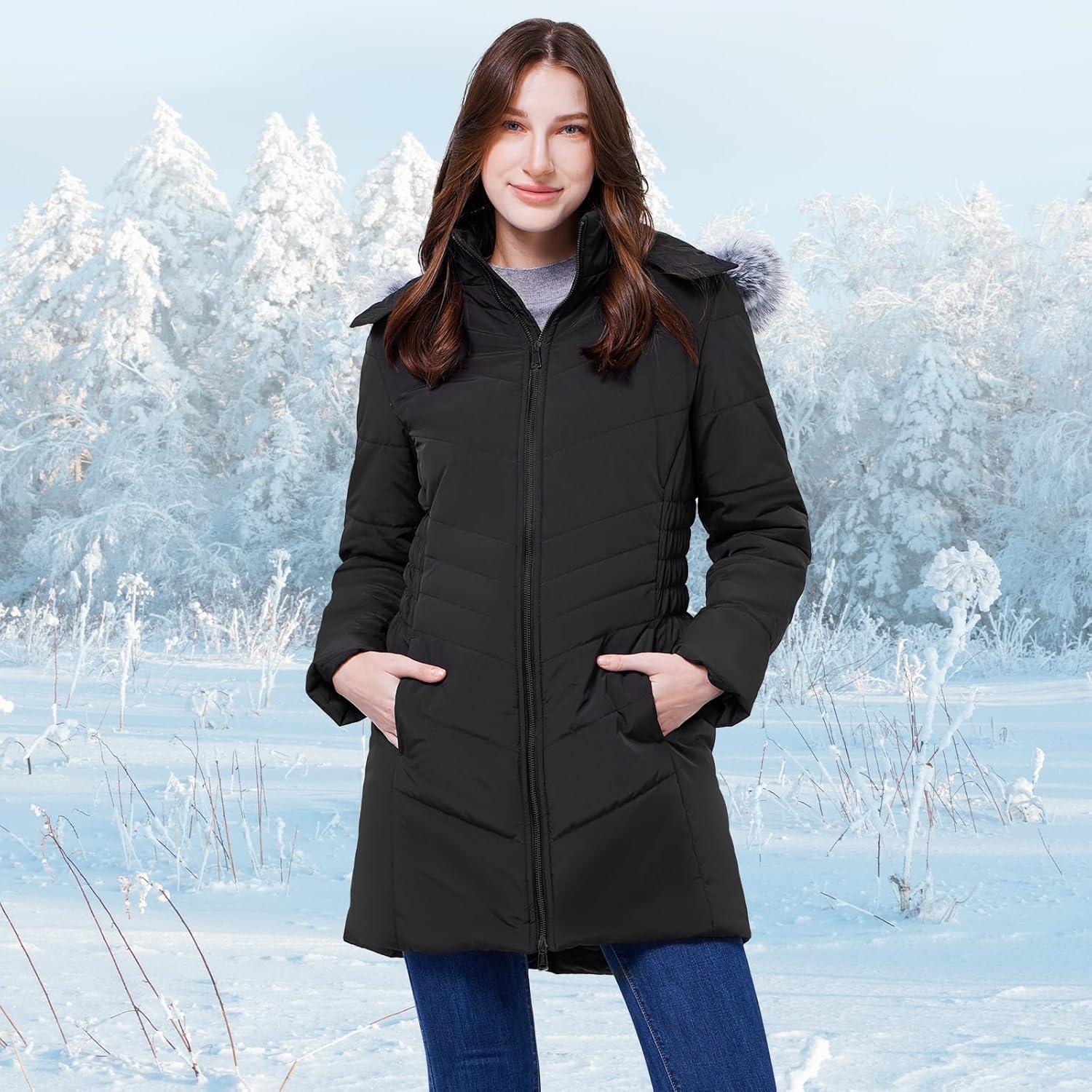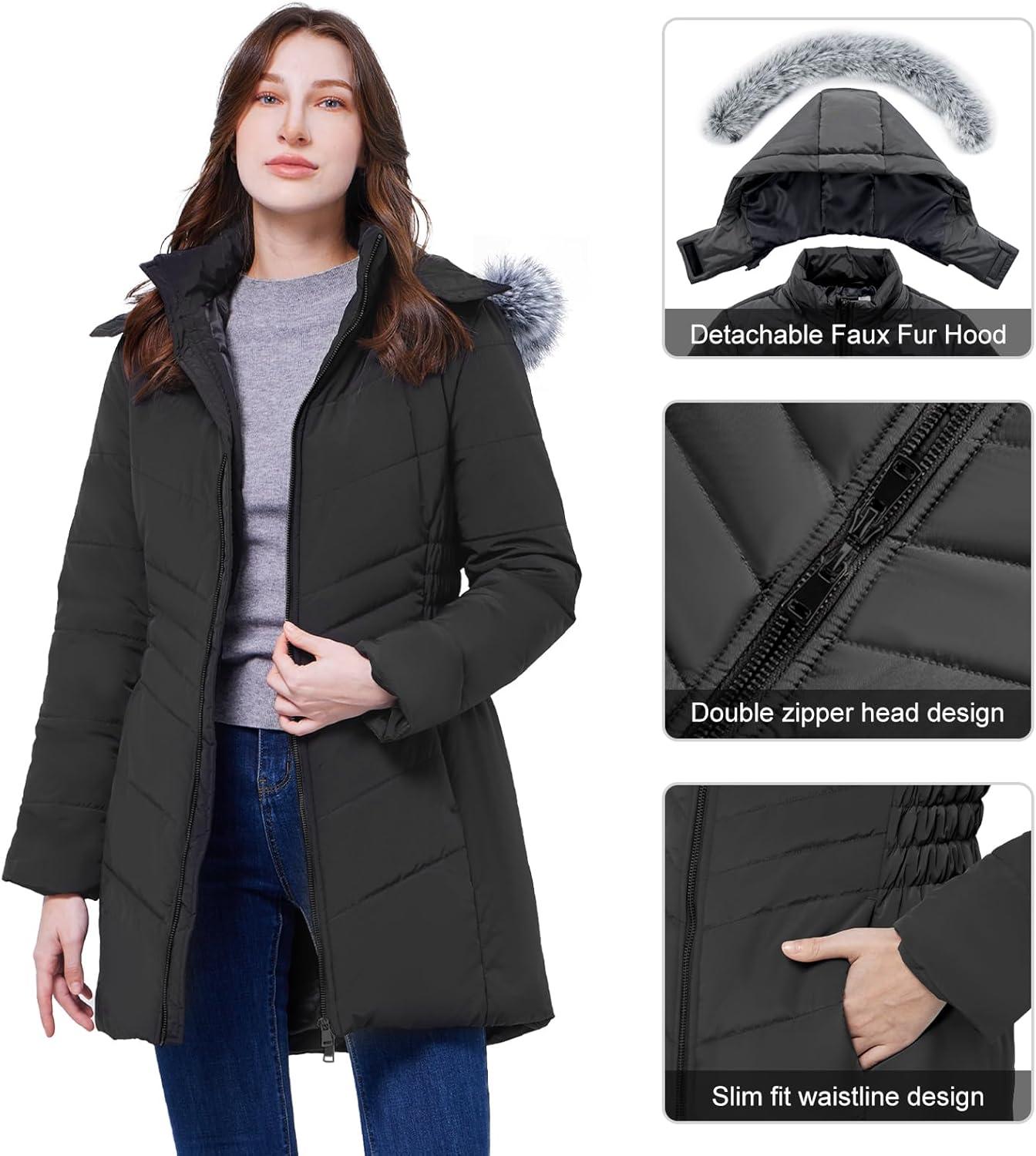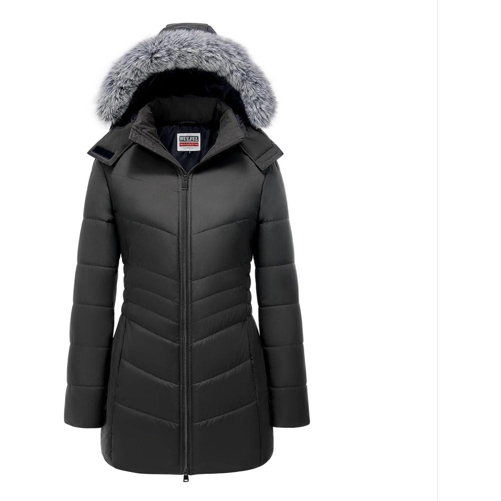 WULFUL Women's Winter Coats Long Warm Thicken Puffer Jackets Outwear With Removable Fur Hood(Black)