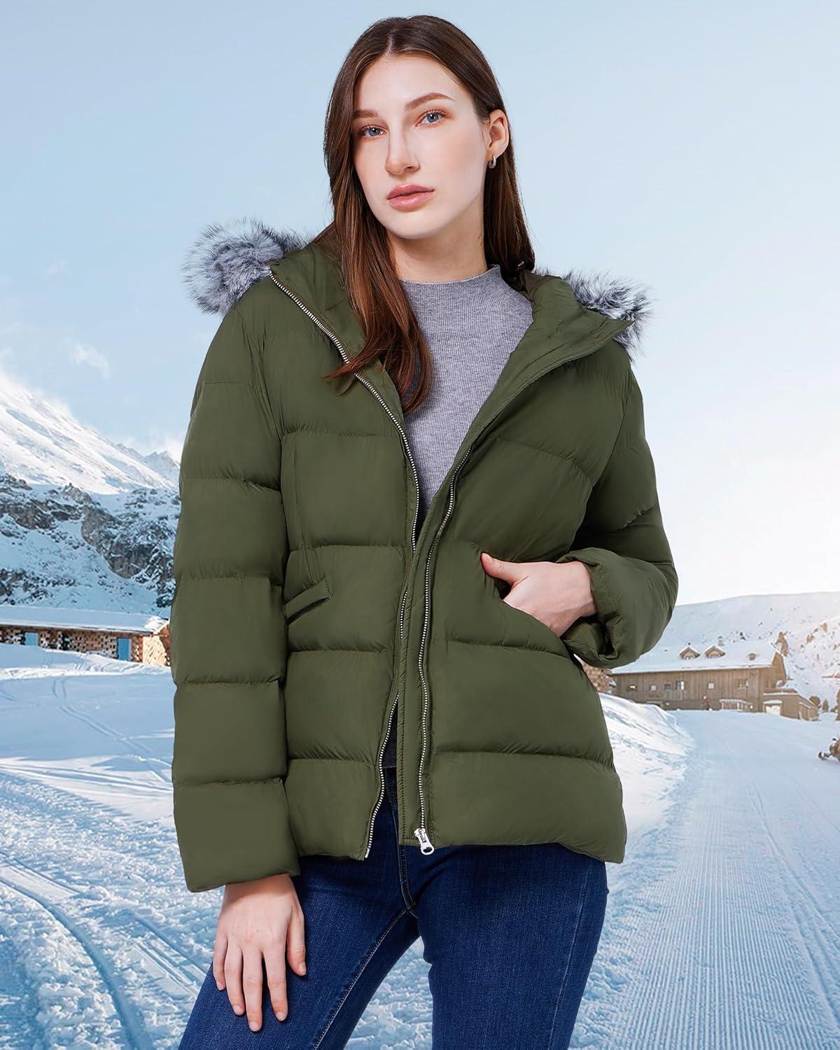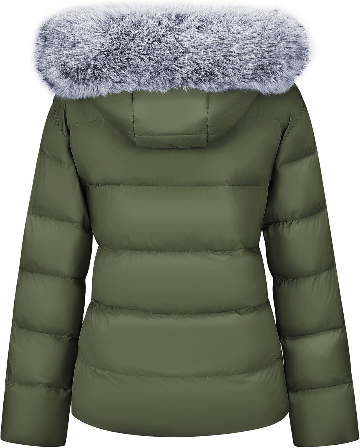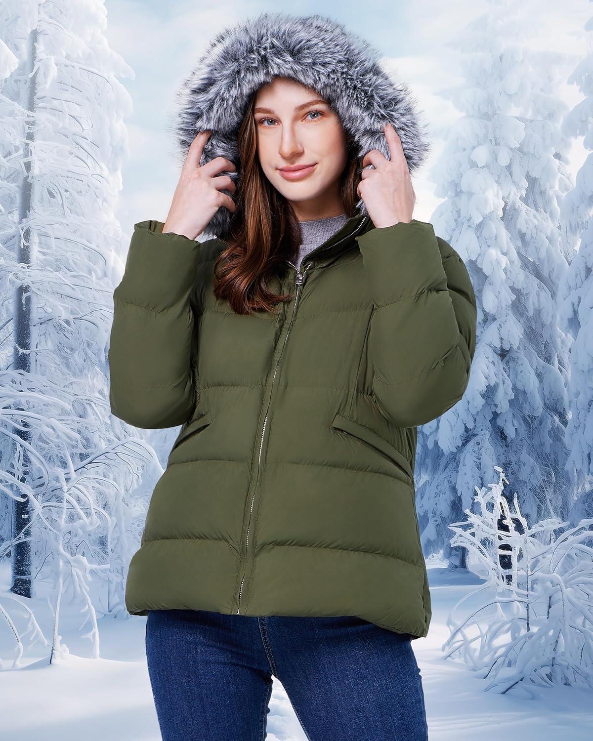 WULFUL Women’s Winter Coats Warm Lightweight Thicken Puffer Jackets with Faux-Fur Hood(Army Green)