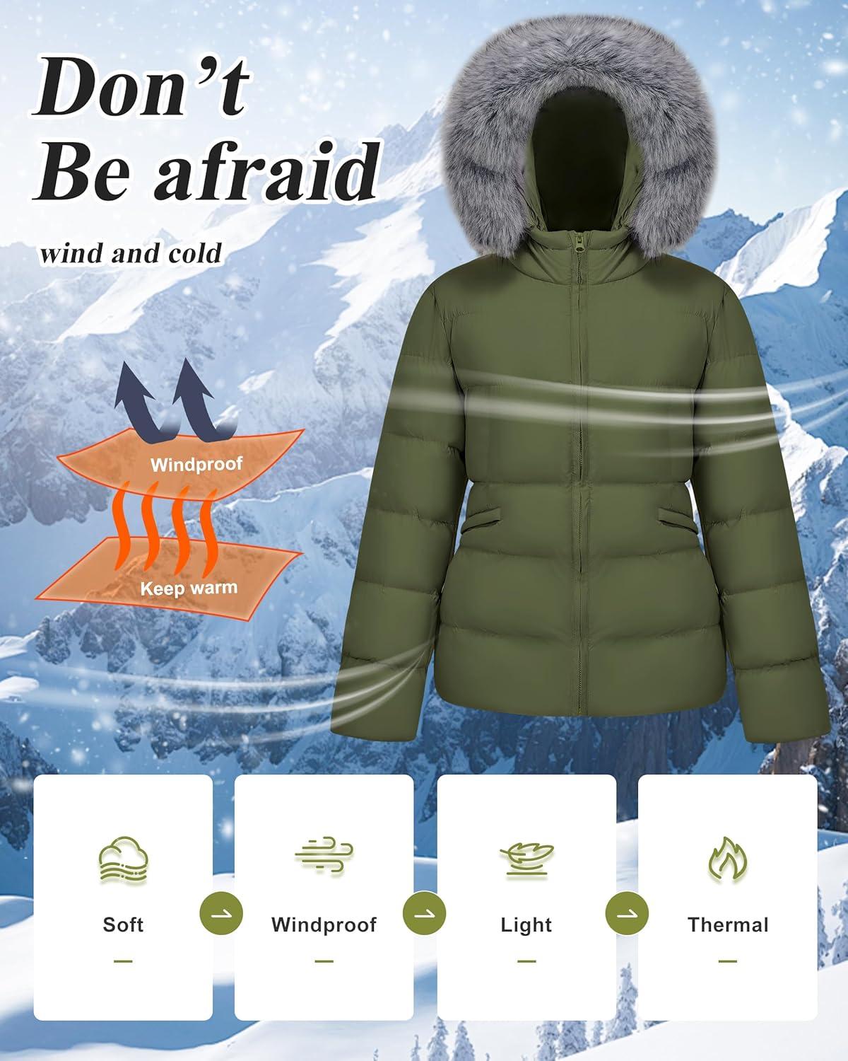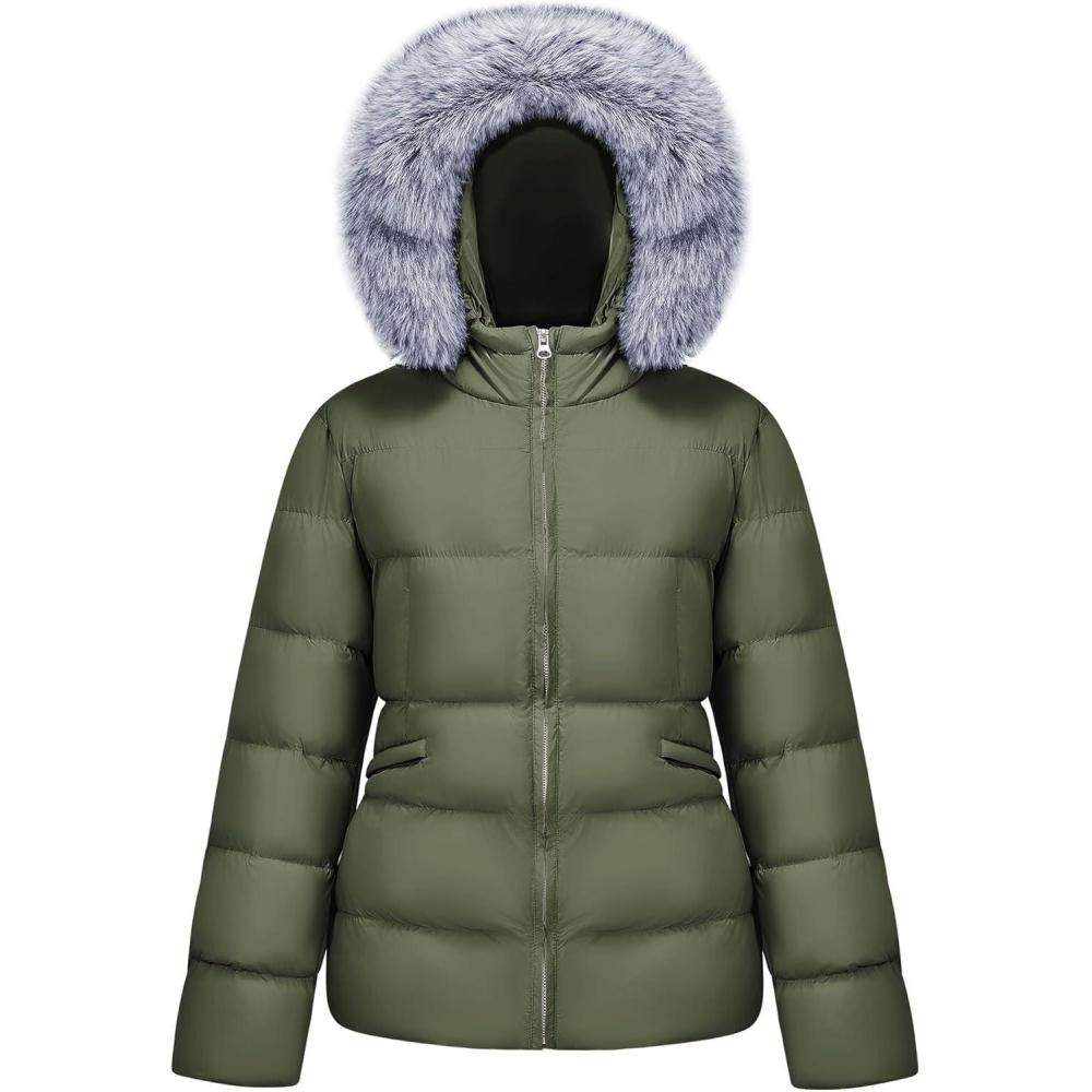 WULFUL Women's Winter Coats Warm Lightweight Thicken Puffer Jackets with Faux-Fur Hood(Army Green)
